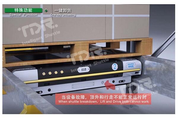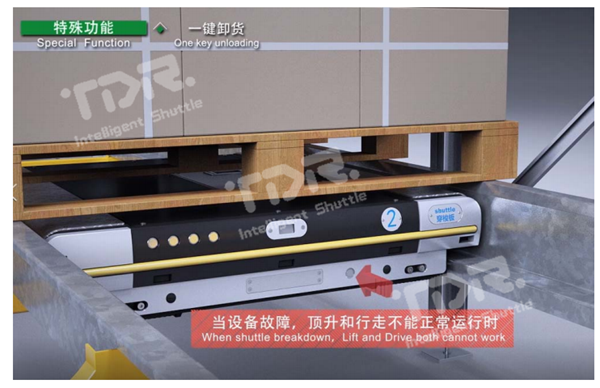 當(dāng)使用救援車救援穿梭板時,如穿梭板處于重載狀態(tài),則很難將穿梭板帶貨物一起拖出,通過此功能,一鍵即可將托盤放置到軌道上,直接將穿梭板拉出即可。